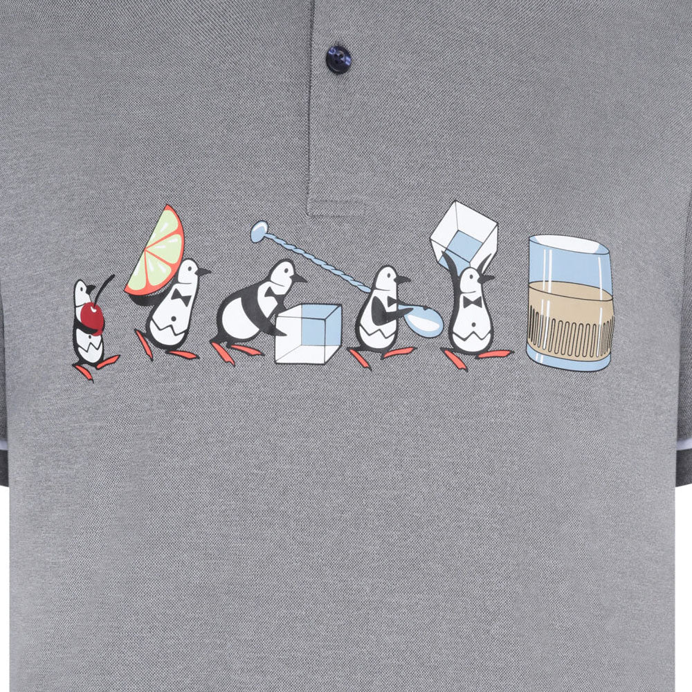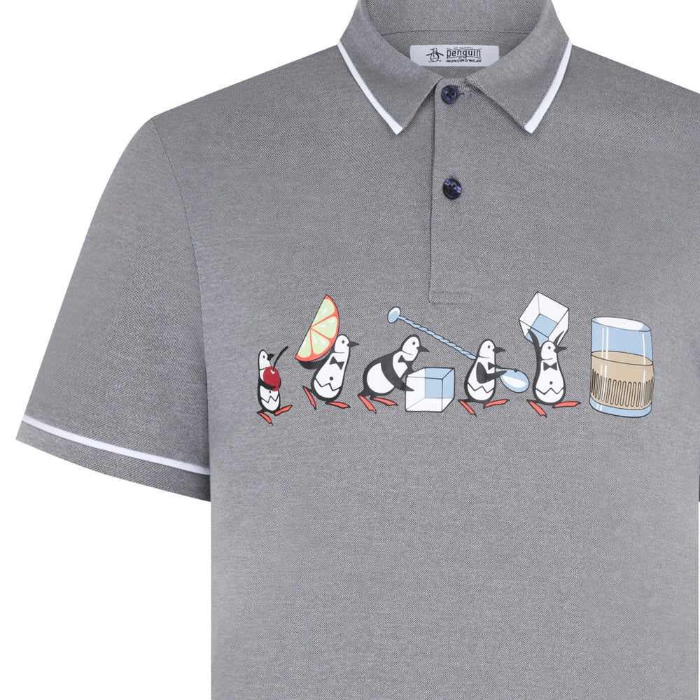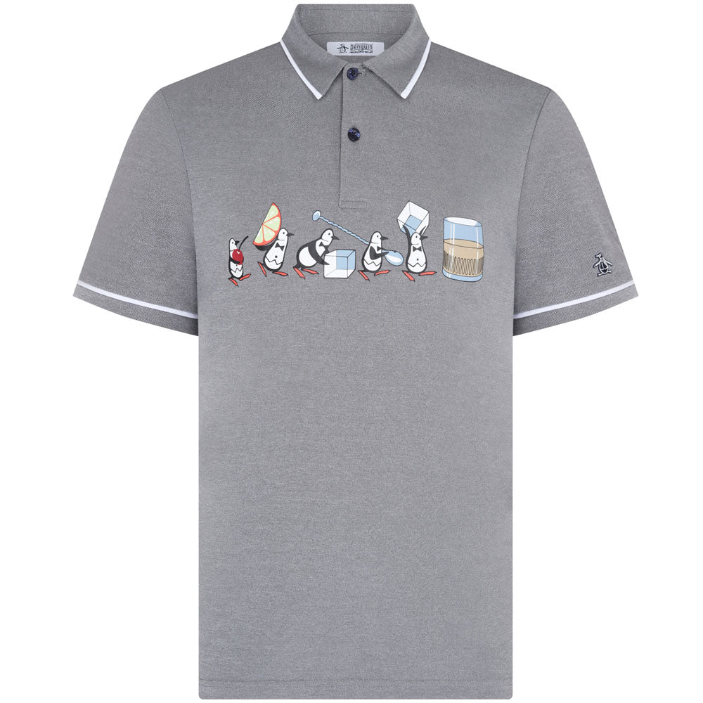 Our mascot Pete is showing off his bartending skills on the front of this playful Original Penguin polo shirt.