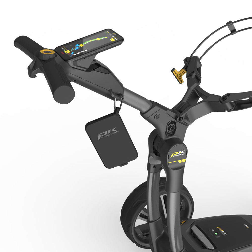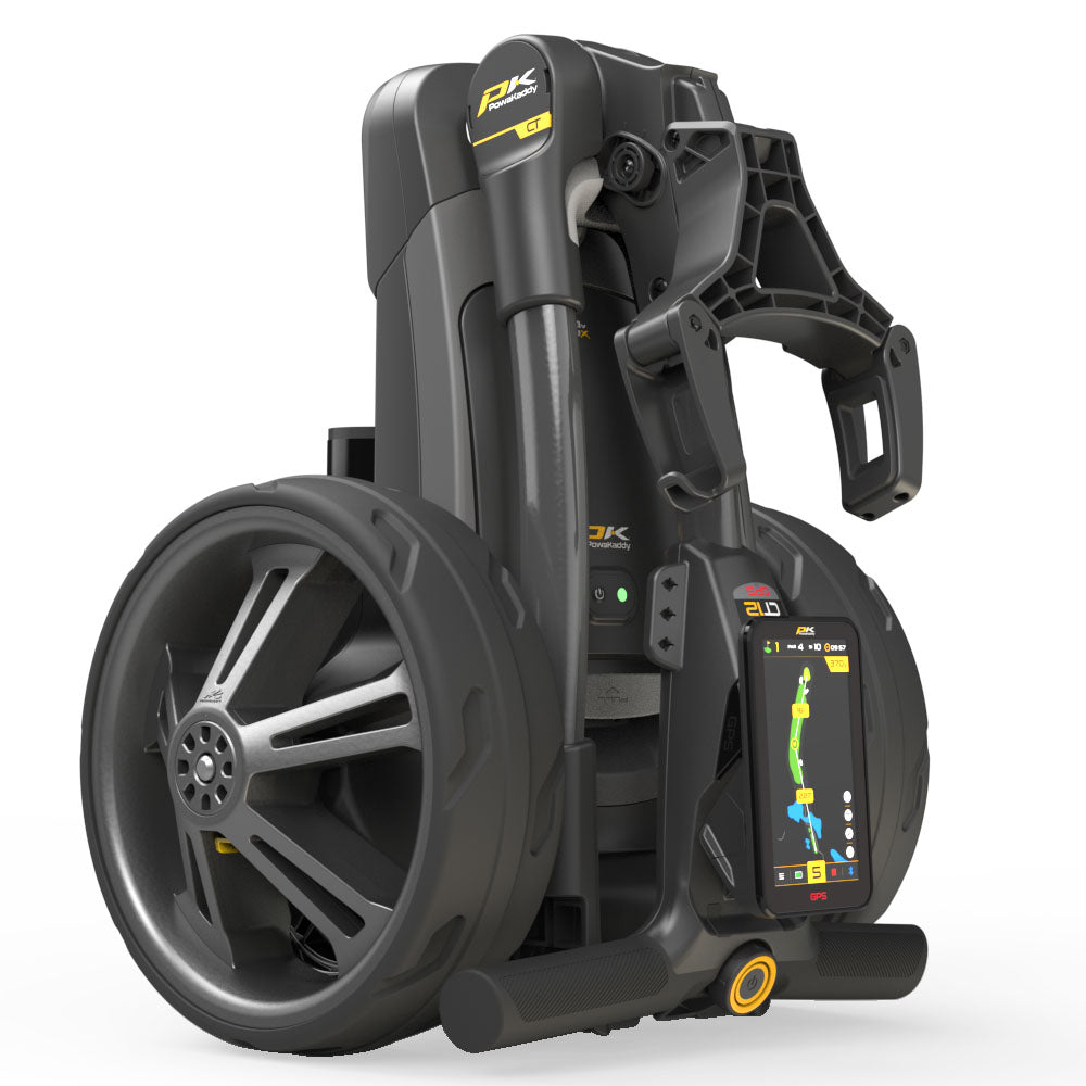 The all-new patented 2025 CT12 GPS EBS features a stunning 5” HD portrait touchscreen. The largest on the market, it affords the user an immersive true FULL HOLE experience. A self-sensing EBS™ Electronic Braking System automatically slows the trolley on steep inclines – clever technology automatically maintains the desired walking speed giving the golfer complete control.